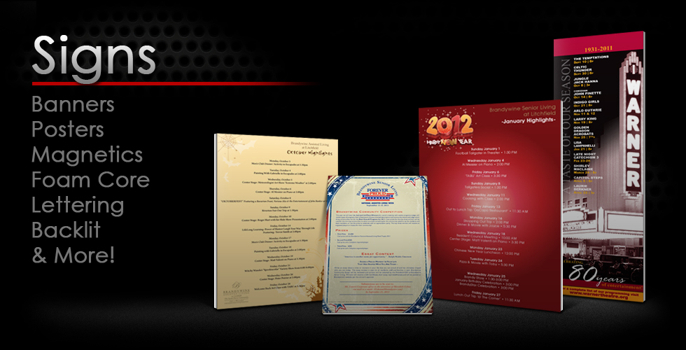Make an impression with custom signage for your business or event. From foam core and plexi to posters and magnetics, we can manufacture signs in any shape and size. We can even produce and install banners and vinyl lettering.